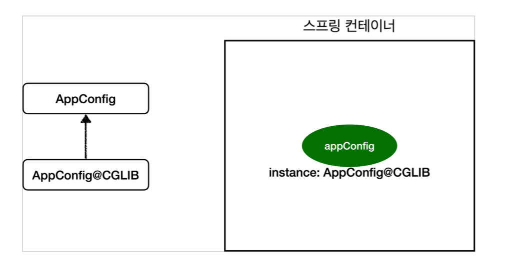 내가 AppConfig를 넘겨주면 스프링은 그것을 있는 그대로 스프링 빈으로 등록하지 않는다. CGLIB이라는 바이트코드 조작 라이브러리를 사용해서 AppConfig를 상속한 다른 클래스(AppConfig@CGLIB)를 만든다. 그리고 이 클래스를 스프링 컨테이너에 등록한다.