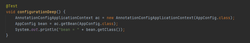 스프링빈 설정 정보를 담은 AppConfig를 AnnotationConfigApplicationContext로 넘기면, AppConfig 또한 스프링 빈으로 등록된다. AppConfig 파일을 스프링 빈에서 꺼내서 출력해보면...