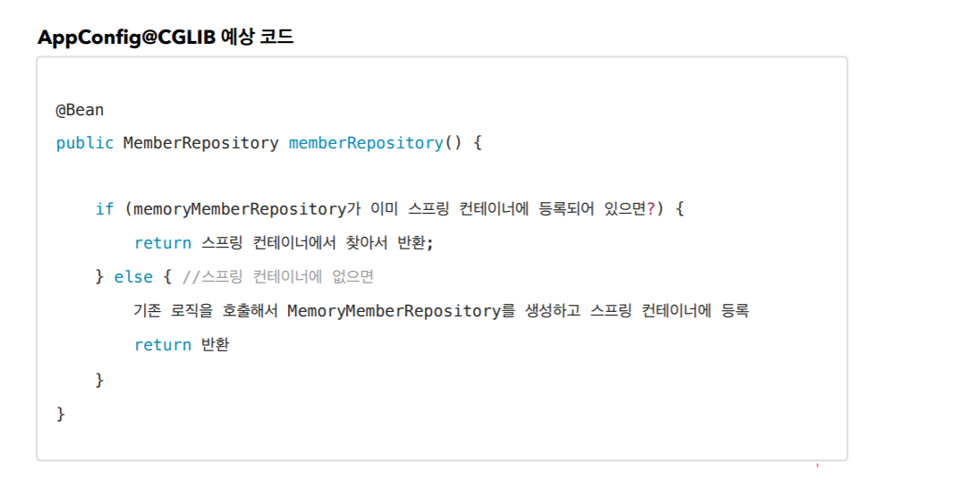 가공된 클래스인 AppConfig@CGLIB을 예상해보면 위와 같다. MemoryMemberRepository는 MemberRepository에 주입되는 하위객체이다. MemberRepository라는 객체를 스프링 빈으로 등록할 때, 하위 객체가 이미 등록되어 있다면 등록된 하위 객체를 찾아서 바로 반환한다. 등록하려던 객체 또한 바로 등록된다.