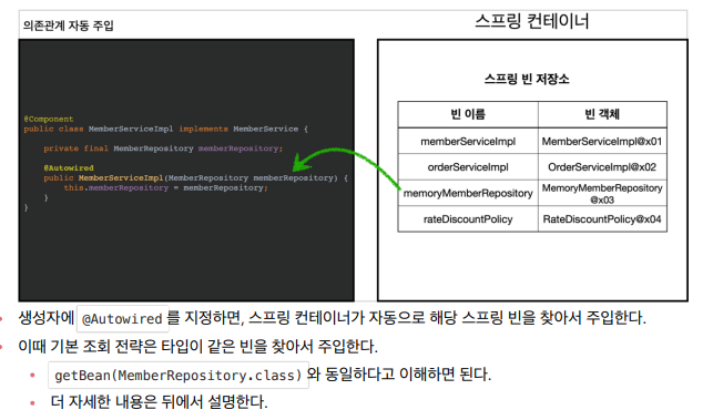@Component가 붙어있는 애들이 먼저 spring container에 등록 되고, @Autowired를 만나면 bean에 있는 클래스를 보면서 type이 일치하는 애를 찾는다. 위 예시에서는 memoryMemberRepository의 type이 parameter에 있는 MemberRepository와 일치한다. 따라서 이 녀석을 데려다가 MemberServiceImpl에 주입한다.