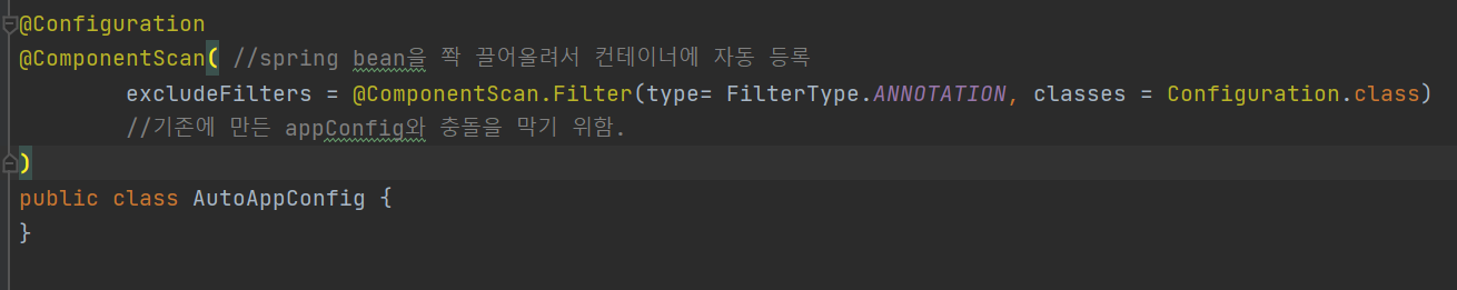 이 때, basePackages를 지정하지 않는다면, 설정정보 class가 있는 package 안에 있는 컴포넌트가 등록 대상이 된다!