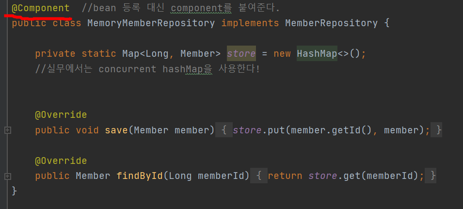 그리고 등록하고 싶은 class에 @Component를 붙인다. 이렇게 하면 spring이 spring container에 알아서 bean 등록을 해준다.