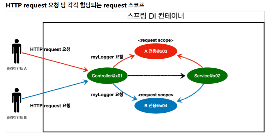 @Scope(value = "request") // 이 빈은 http 요청 당 하나씩 생성 & http 끝나는 시점에 소멸
