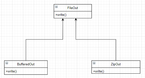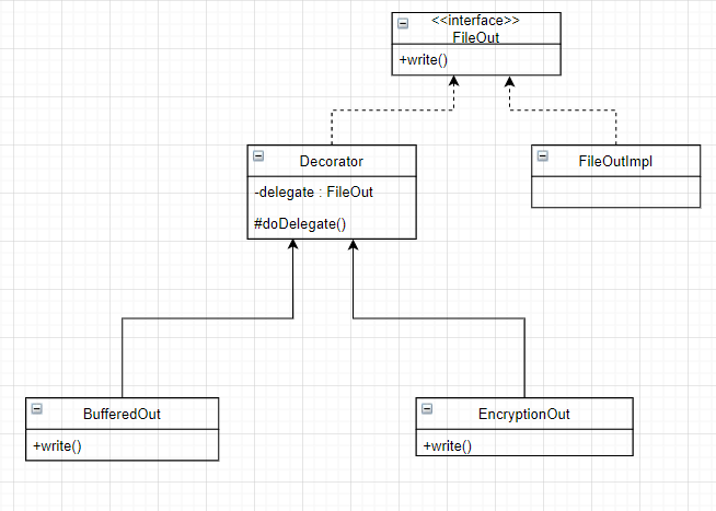 Decorator 클래스는 하위 구체 클래스를 위한 추상 클래스이다. FileOut을 delegate로 받아서 쓰기 작업을 delegate에게 위임한다.