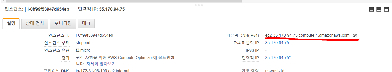 다시 AWS 인스턴스 페이지로 가서, 페이지 하단에 퍼블릭 DNS를 복사합니다.