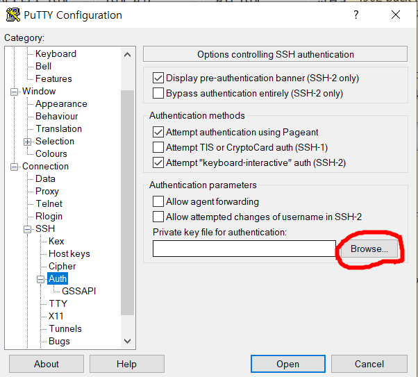 좌측 탭 - SSH - Auth -Browse로 위에서 만든 .ppk 파일을 찾아줍니다.