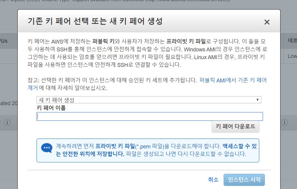또한, 아래 단계에서 이 키페어 파일이 필요하므로, 저장 위치를 잘 기억해둡니다.
