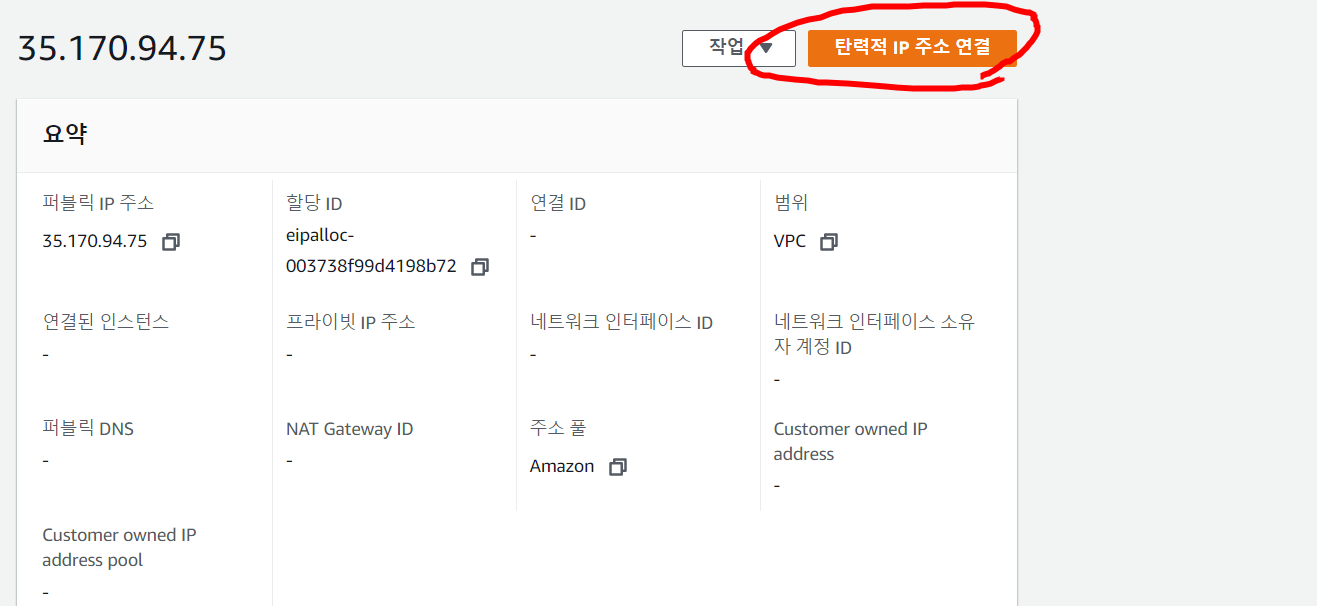 8. 탄력적 IP 주소 연결을 눌러 줍니다.