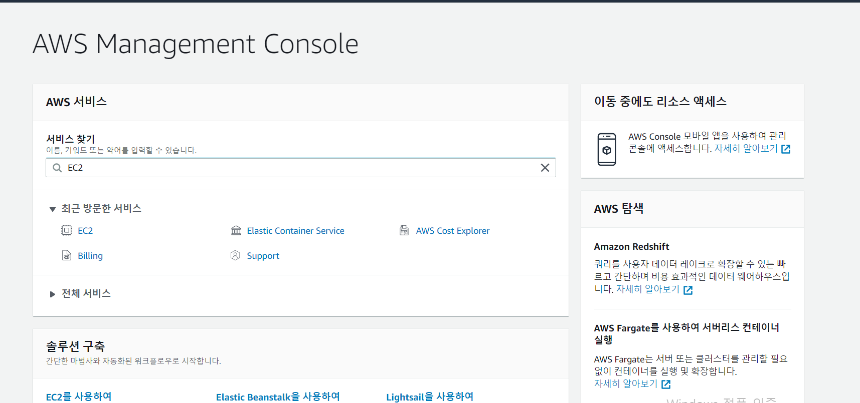 1. 로그인 이후, 서비스 찾기에서 EC2를 검색합니다.