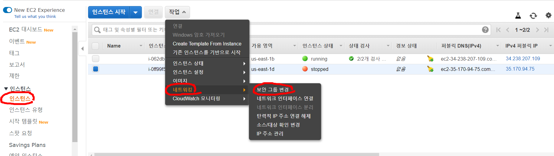 좌측 탭 인스턴스 - 인스턴스 선택 - 작업 탭 - 네트워킹 - 보안 그룹 변경으로 방금 만든 보안 그룹을 설정해 줍니다.