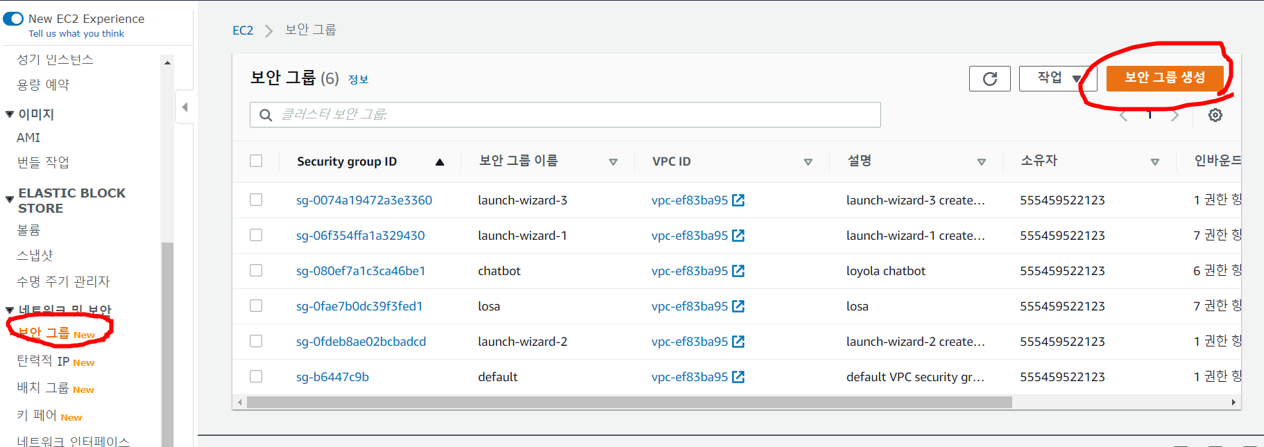 좌측 탭에서 보안 그룹 - 보안 그룹 생성을 클릭합니다.