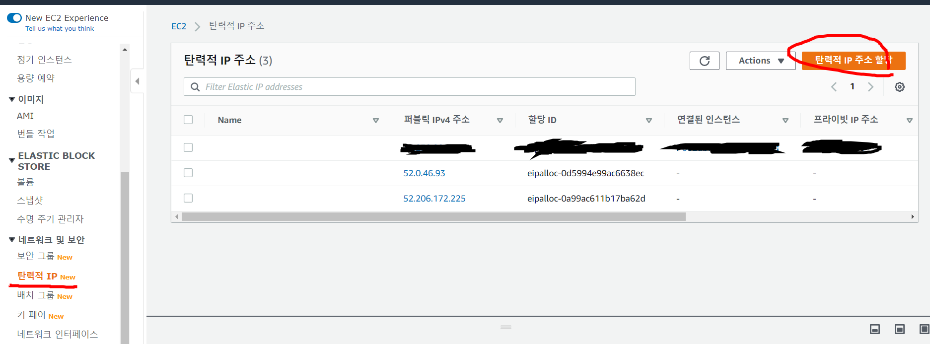 6. 이어서 탄력적 IP를 설정해주어야 합니다. (이름과 달리 이는 IP를 고정해주기 위함입니다.)